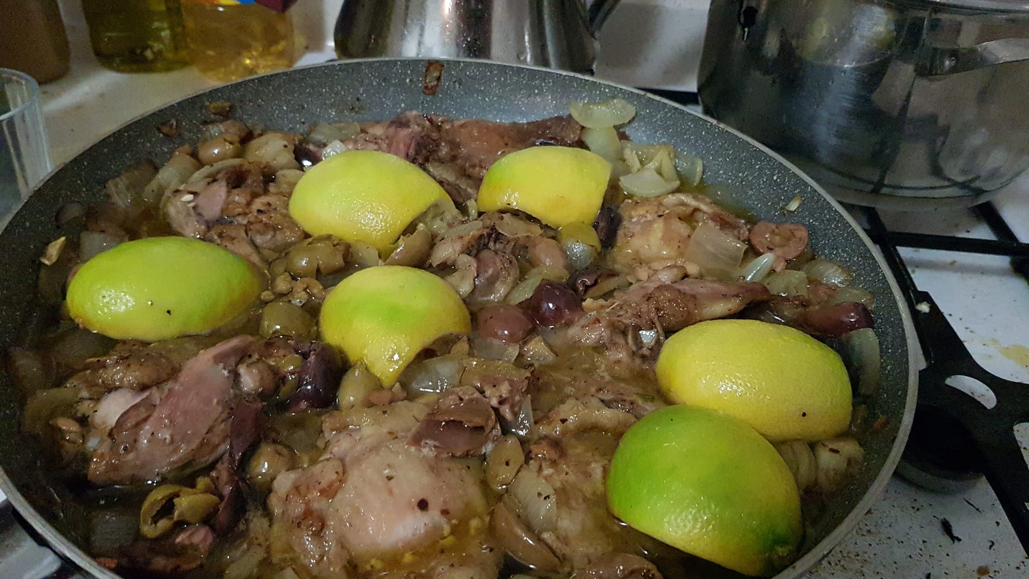 Arrange all the chicken things back in the pan, skin-up, and slice lemons in a fancy way and arrange on top of the stuff. Put the lid on, turn it down low, and let it all baste until the chicken is falling-apart tender, about half an hour. Add a little bit of water or chicken stock if there isn't enough liquid at the bottom, but the chicken should release a fair bit. Finish it off with a sprinkle of chopped parsley and a squeeze of lemon.