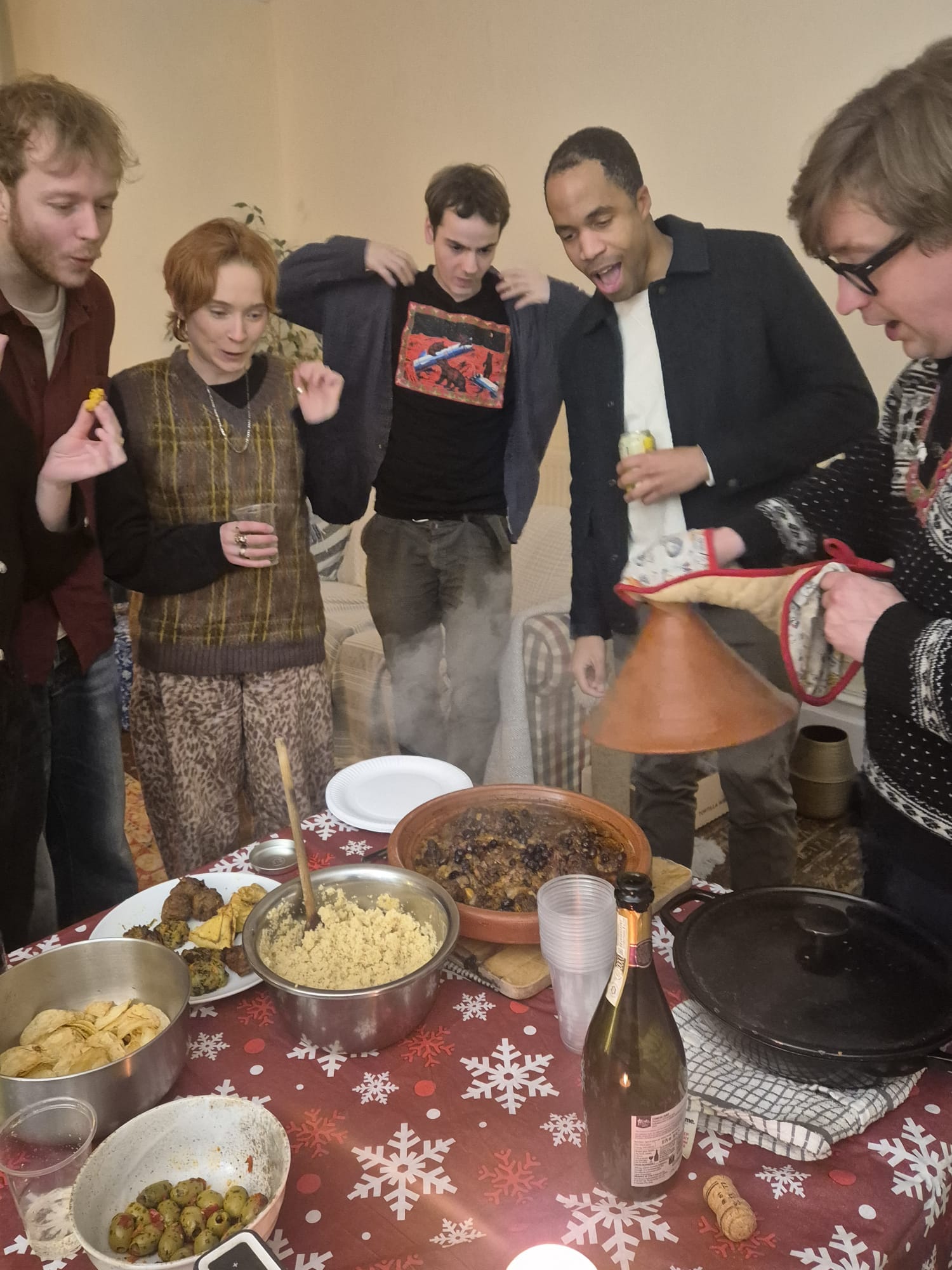 - Holiday party dinner - in keeping with my penchant for street pots, I found a clay tagine on the street, soaked it in the tub overnight, and seasoned it with olive oil in the oven. Rachel put together a big holiday party and had a bunch of people over, and this became the opportunity for a lamb tagine. I have promised two tagine recipes to Liv and I include them below.