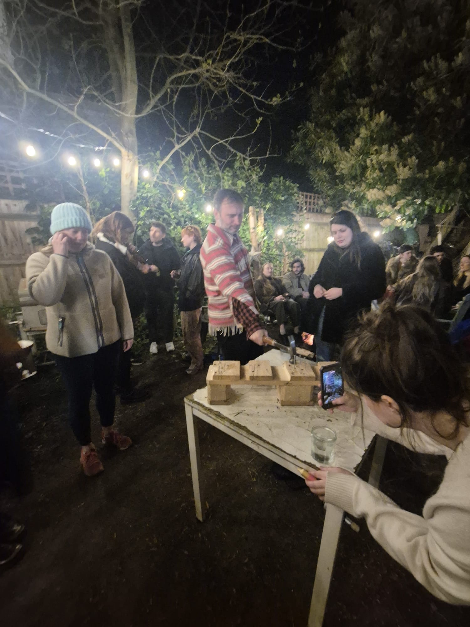 - The Mansions had its Springtime party BBQ where all the neighbors come out and engage in various revelry. There is folk music, conversation, a fire in an old engine shell, many grilled things, potato salad, and the Mansions original game of "Nailhammer", a rustic endeavor where everyone takes turns driving their nail into a plank of wood. One participant commented: "It's like a medieval village in here."