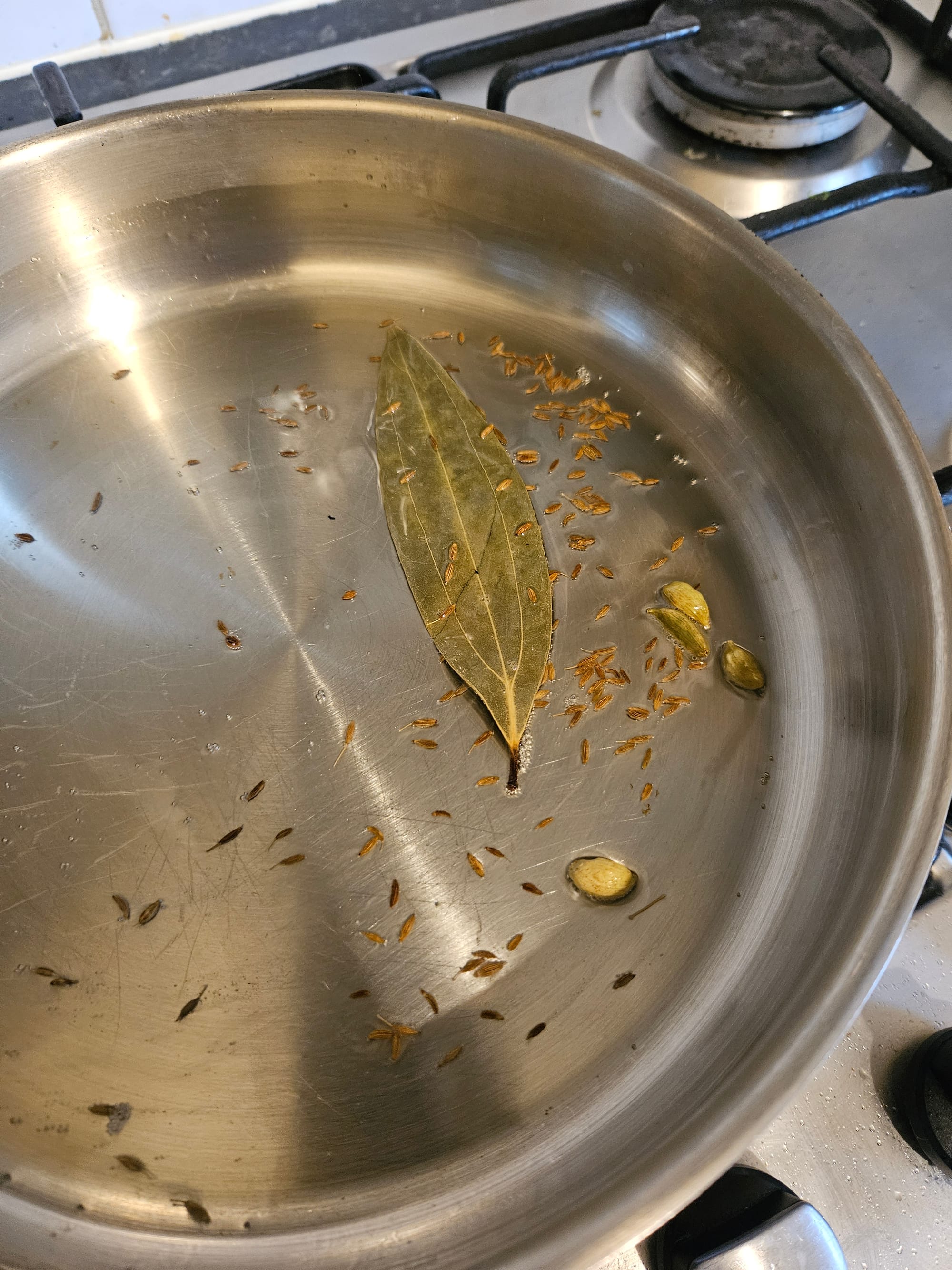 Temper whole seeds in oil. The kind of oil and the kind of seed determines your region, and is the "nostalgia" level of flavor. Kerala food uses white urad dal, curry leaves and mustard seeds in coconut oil, bengali food uses panch phoran (nigella, cumin, fenugreek, mustard, fennel) in mustard oil, Mughal food uses ghee and cumin and cinnamon stick. Here I used vegetable oil with cumin, cardamom and Indian bay leaf, which together gives it an earthy, cinnamony, herbal kind of aroma.