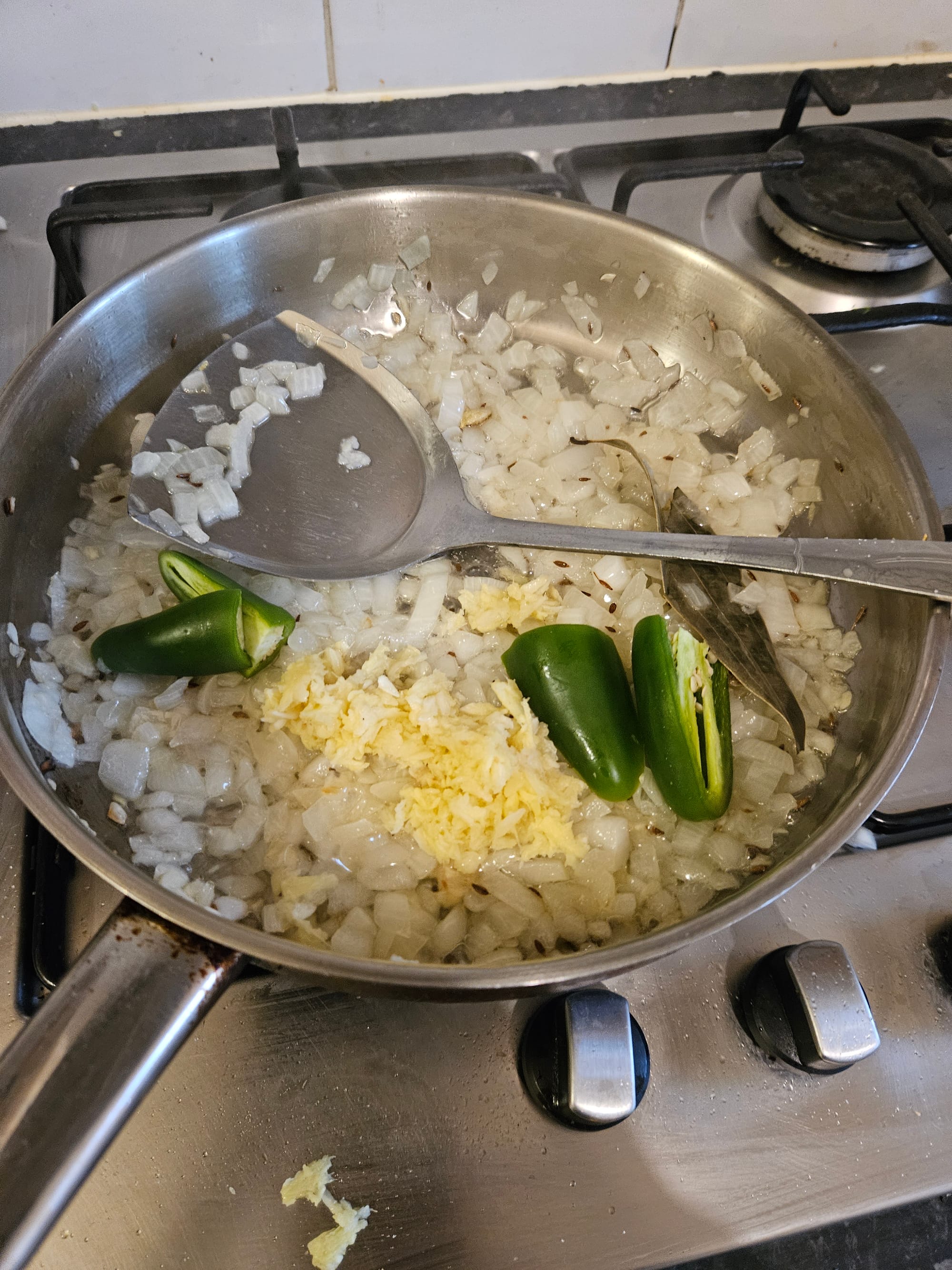 Next, cook onions. A pinch of baking soda will help them go brown faster. The level of brownness determines the sweetness and depth of flavor. Next: garlic+ginger paste and sliced green chili or dried red chili. Play around with the garlic/ginger ratio.