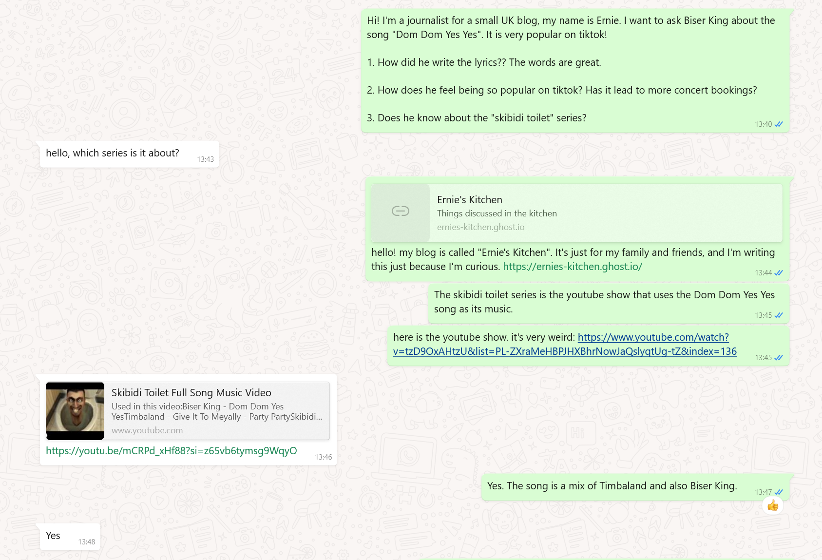 I reached out to Paryss Bryanne, Kai Cenat, Yasin Cengiz, and Biser King for this article. Biser King was the only one to respond. I thought at first I was talking to his publicist, but I realized it was actually just his literal phone number I'd found. He first asked me which series I was talking about, and then texted me a link to Skibidi Toilet. Then he gave me a thumbs up, and said “Yes”. At least he understands the premise of Yes Yes No.