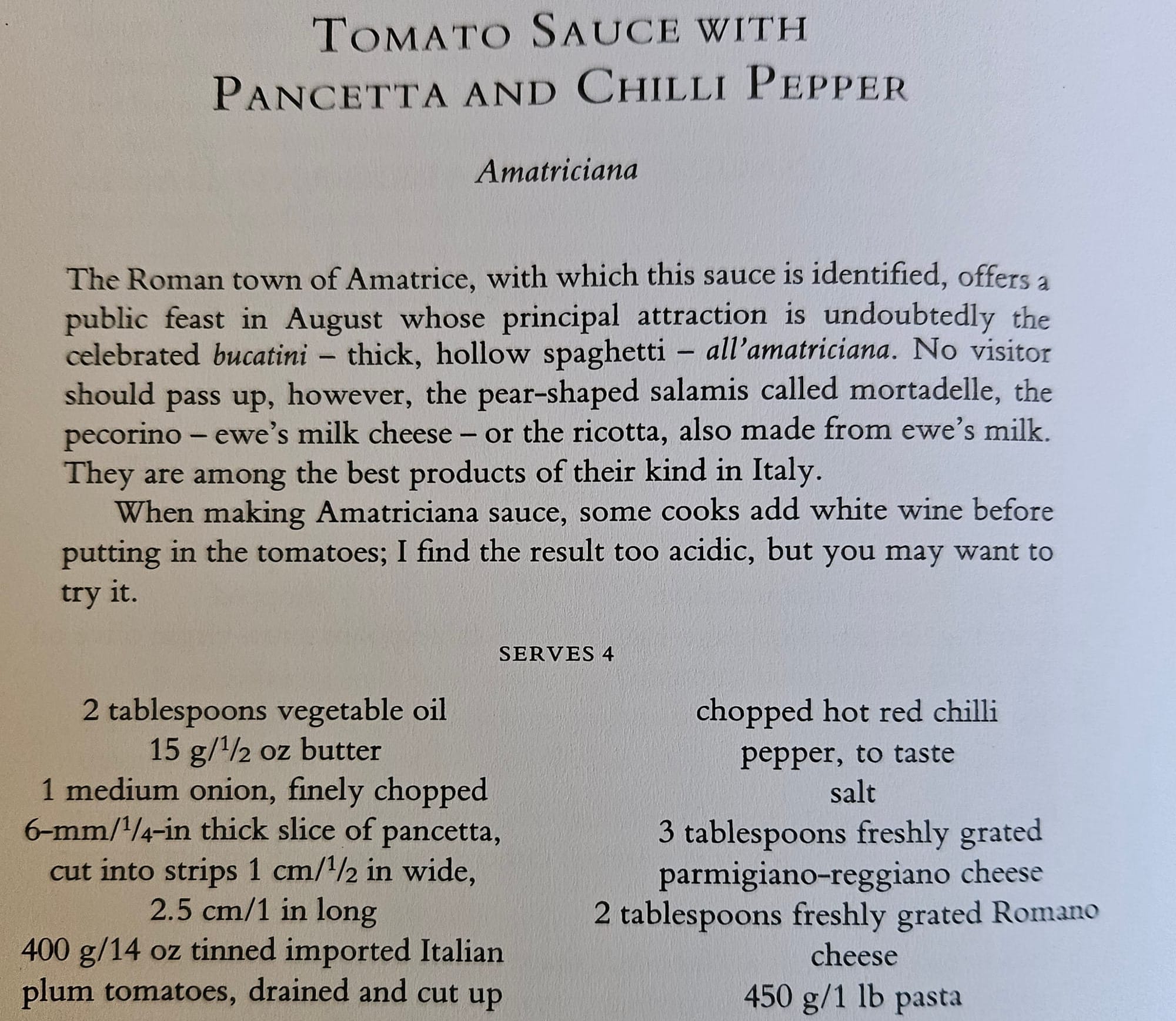 I will summarize the instructions briefly: saute onion on med low until transluscent and gold, add pancetta and cook for another minute, add tomato and chili and let cook down until think, about half an hour. Add pasta and a giant handful of grated cheese. Perfect brainless food.